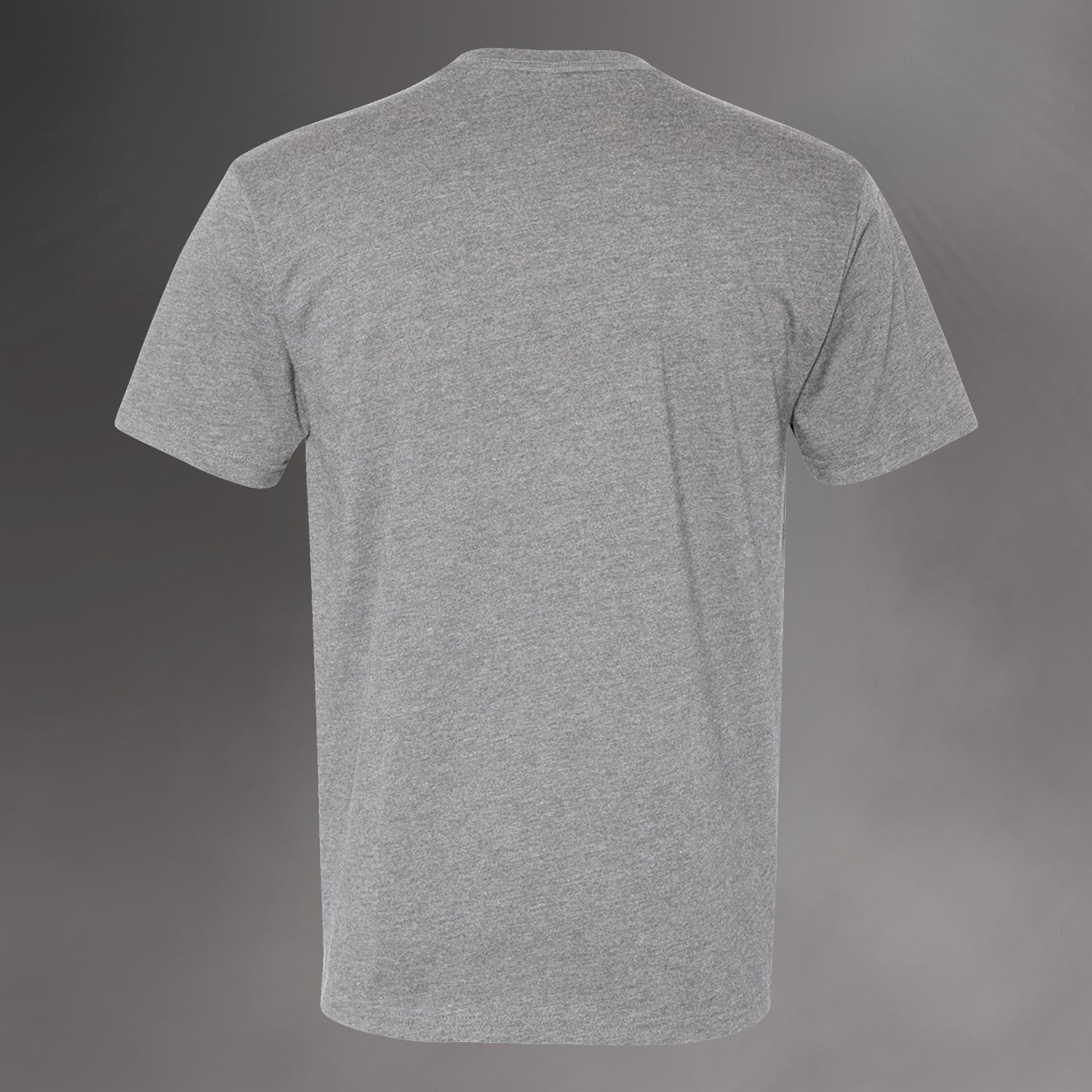 GARMENT: Printed on a heather grey, super-soft, fitted, 60% combed cotton, 40% polyester shirt with black screen printing.